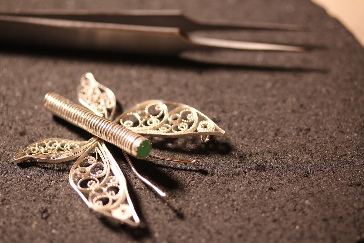 Abandonner mes rêveries n’était pas concevable. Alors, j’ai commencé une formation afin de devenir maître filigraniste. Pourquoi choisir la technique ancestrale du filigrane ? Parce que je fus immédiatement séduite par la finesse et la délicatesse du travail de ces orfèvres. Ces fils d’argent torsadés et ensuite laminés afin de former une dentelle précieuse, j’avais les yeux qui brillaient à nouveau.