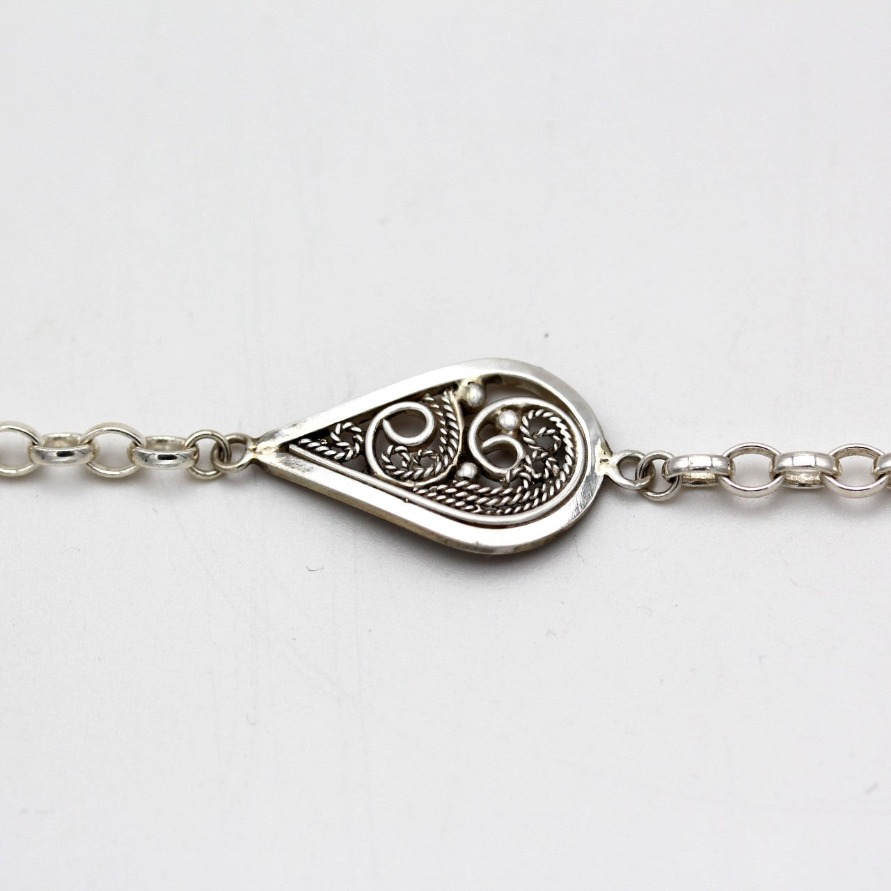 Au cœur de cette goutte, des arabesques en fil d’argent torsadé dansent comme les courants sous-marins, évoquant les mouvements gracieux des algues bercées par les vagues. Chaque courbe, chaque volute semble raconter une histoire, une promenade entre les reflets d’argent de l’eau et les secrets qu’elle renferme.